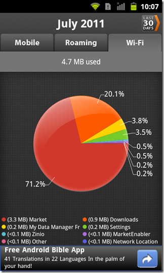 With My Data Manager, you can set the parameters for mobile data usage and roaming plans according to your package subscriptions, thereby enabling a notification when this limit is reached/exceeded. The app is supplemented by a smart little home screen widget that notifies you of all data download information and the remaining days before your data subscription plan expires. The graphical representation of all the downloaded data in the form of three separate bars (for mobile data, roaming data and Wi-Fi data) makes it easier for users to keep a close check on all the information pertaining to their downloaded data. You can view the data consumption of each app by checking out the number of bytes that have been downloaded by that particular app. Similarly, you can also view the percentage of the total space consumed by each app that has been downloaded into your device.