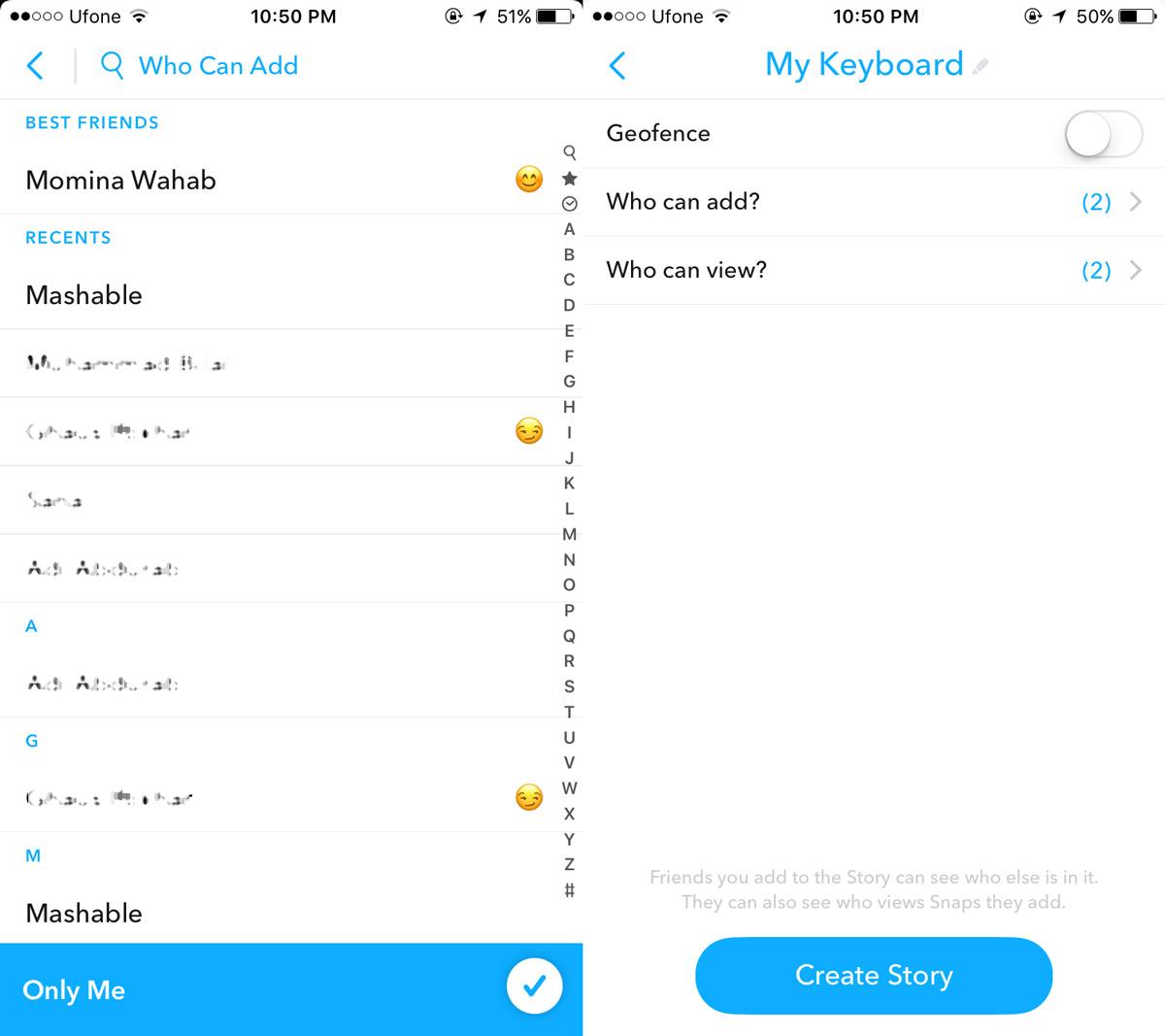 When you create Snapchat stories with friends, there are two ways to select which friends can add snaps to it. You can add a geo fence or you can pick friends from your contacts.