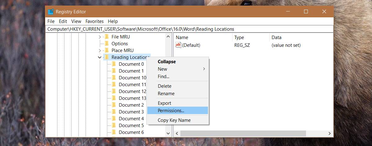 To disable pick up where you left of for all documents, right-click the Reading Location key, and select Permissions. Click ‘Advanced’.