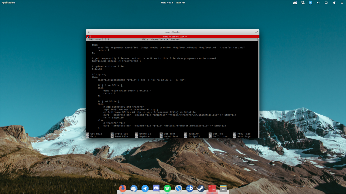 Using Nano, go to the very end of the file. Then, paste the Transfer SH Alias code. Be sure to paste each and every bit of the code, or the bash alias will not work.
