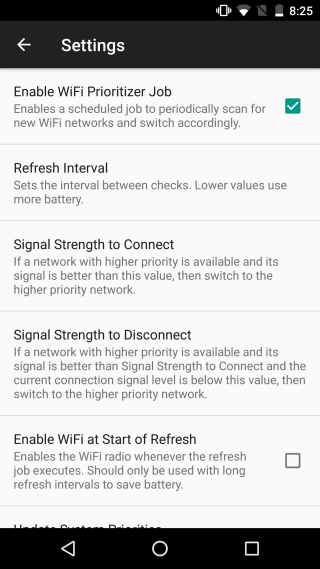 With WiFi Prioritizer running, you don’t ever have to manually switch WiFi networks. When you set WiFi connection priority using the app, it still looks at the signal strength of a connection but if you have two strong or two weak connections, you can select one to be preferred over the other. If you’d like for your device to ignore a connection but don’t want to remove it, simply uncheck the connection in the app’s list. The app will no longer connect to it regardless how strong the signal is.