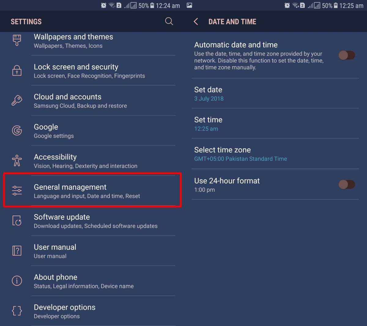 In order to unlock OEM Unlock on Samsung Galaxy S8/S9/Note 8 without having to wait an entire week, you need to change how time is set on the device, and how updates are received. Make sure you’ve already configured a Samsung and Google account on your device.