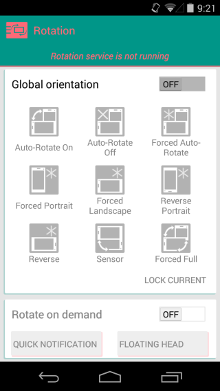 Rotation on demand lets you select screen rotation on the fly without having to switch to the app first. When enabled, you can manage it from a floating head or from a notification in the notification area. The floating head seems to be more convenient to use. You can disable the app, access its settings, or manage rotation from it.