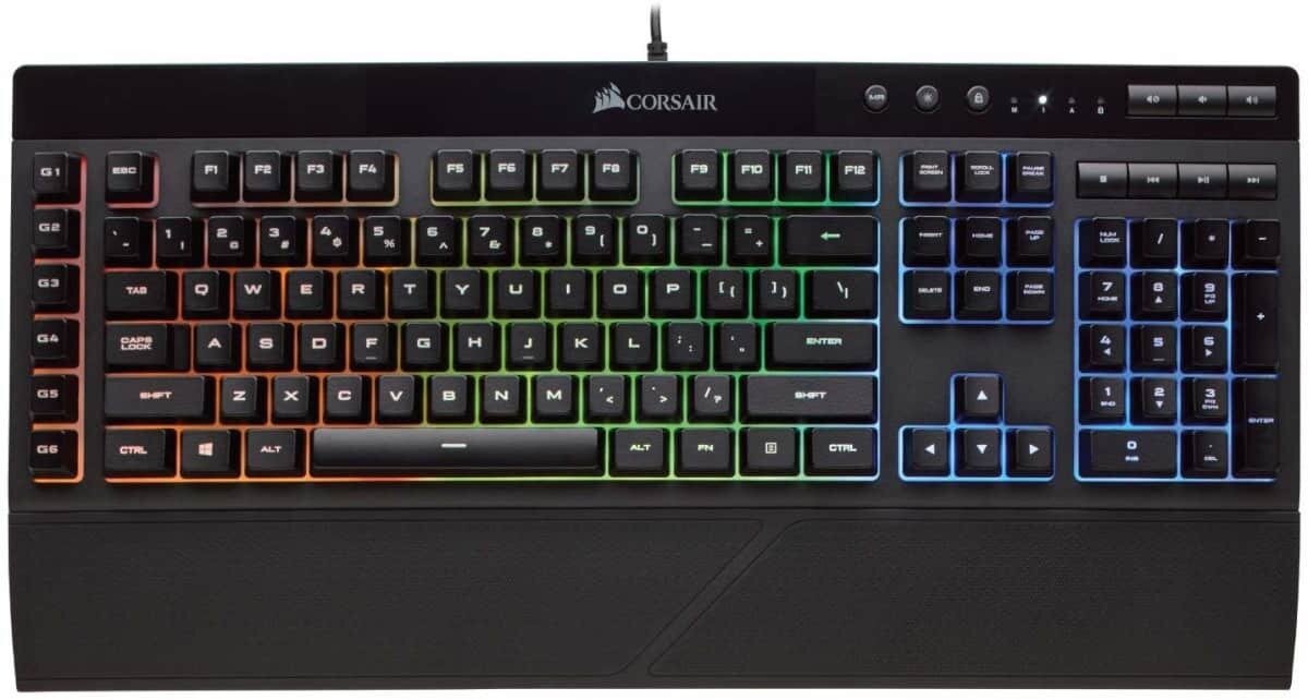 The Corsair K55 RGB gaming keyboard is a membrane-based gaming keyboard for PC built by the gaming company Corsair. It has a fully programmable key-row that users can use for custom actions, a set of media keys that let users control media playback, and a volume control system.
