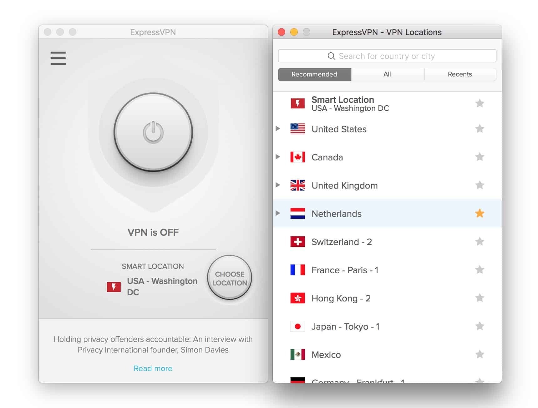 - Si desea conectarse a un servidor en una ubicación específica, use la ronda más pequeña Elija el botón de ubicación a la derecha del botón principal. Esto abre la ventana de ubicación de VPN, donde puede buscar un servidor en un país o ciudad en particular usando la barra de búsqueda en la parte superior, o navegar a través de los servidores recomendados, ver todos los servidores o ver sus favoritos. Haga clic en cualquier ubicación del servidor y la próxima vez que se conecte, estará conectado a un servidor allí.