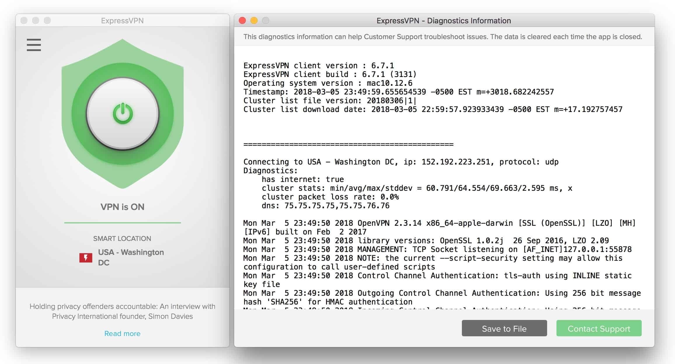 Si hace clic en ver diagnóstico, verá un archivo de texto con la salida del software que le mostrará cualquier error. Pero si encuentra esto demasiado confuso para entender, no se preocupe. Puede usar la opción de diagnóstico de guardado para guardar la salida como un archivo .txt que luego puede enviar al soporte de ExpressVPN junto con una descripción de sus problemas y podrán decirle qué es lo que está mal, en todo caso.