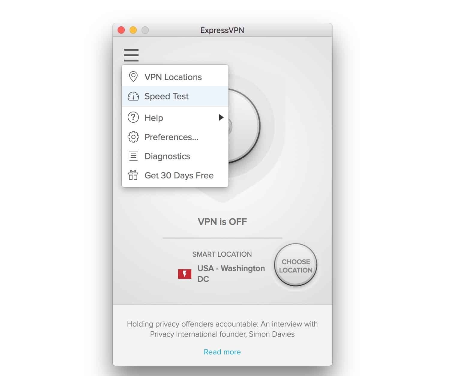 Una de las ventajas de ExpressVPN en comparación con otros paquetes VPN es que incluye una función de prueba de velocidad adicional dentro de su software. Cuando abres la aplicación ExpressVPN, verás una fila de tres líneas horizontales en la parte superior izquierda. Si hace clic en esto, se mostrarán las opciones de la aplicación.