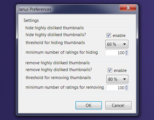The Janus Preferences allow users to hide thumbnails of highly disliked videos. You can set a certain threshold from the drop-down menu for hiding these videos. If you aren’t just content with hiding them you can choose to remove them altogether from the side or from search results by setting a threshold same as you did for hiding them.