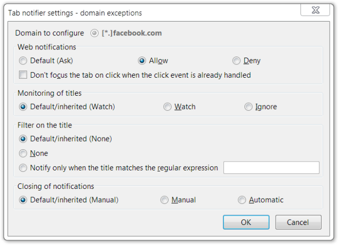 If you choose to disable all notifications and manually enable them for sites you need, open the website in a separate browser. Right-click anywhere and from the context menu select Configure Tab Notifier for site. A new window will open that will allow you set notification preferences for the domain. You can allow or restrict the notification, monitor the domain’s title for changes and how the notification will be closed.