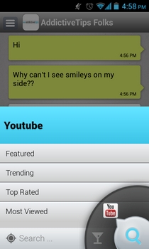 To help you easily find the items of interest, 2ya offers various context-aware sub-menus under each category. The Movies menu helps finding popular movies, nearby theaters and movie titles by genre. The YouTube menu allows browsing featured, trending, top rated and most viewed videos on the popular video hosting network. Restaurants can be searched by cuisines or nearby food sports, whereas for locations, 2ya lets you request location of the recipient, share your own location with them, or edit your current place. Unlike the iOS variant, the Android version of 2ya doesn’t seem to support local media sharing for some inexplicable reason, which is a massive oversight on the developer’s part.