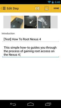 The how-to editor is the highlight of the app’s design. Hit the ‘Create’ option within the app’s menu to bring it up, enter a title for your new tutorial, select a category, sub-category and hit Next. The app should now present you with a comprehensive guide to how the editor works. There’s nothing to it, really. You start at the contents screen, which initially just displays an entry for the introductory section of the tutorial. You can start grabbing new photos or importing existing ones for your guide from this screen.