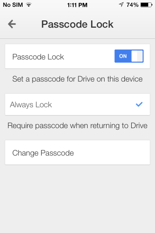 So far, it seems Android users have lucked out. Though the Google Drive app on the Play Store was updated as recently as yesterday, the passcode feature is not part of the changes. Of course Android users can search for and use another app that will let them lock Google Drive and any other app behind a passcode (or even a secret handshake) but it won’t beat the comfort of having the Google Drive app provide the feature itself.