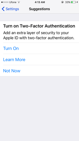 Tap the ‘Turn on Two-Factor Authentication’ option. In iOS 10.3 you can choose to turn it on or ignore it. If you tap ‘Not now’ the ‘Turn on Two-Factor Authentication’ option will not appear under your Apple profile in the Settings app again. To turn it on after tapping ‘Not Now’ tap your Apple Profile and go to Password & Security.