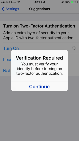 When you set up two factor authentication from your iPhone, you go through almost all the same steps you would on your desktop. You will have to verify your identity by answering your secret questions, verify your credit card information, and verify your phone number.