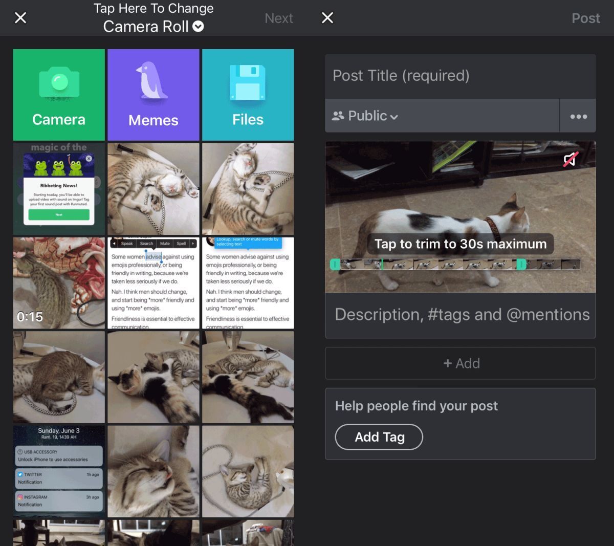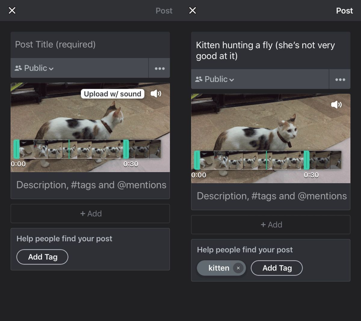 After trimming the video, tap the speaker icon to unmute it and upload it with sound. Give the post a title, add tags, and tap Post to upload it. Imgur is encouraging its community members to use the unmute tag with all GIFs with sounds. You can follow this tag to see what GIFs with sounds others are sharing.