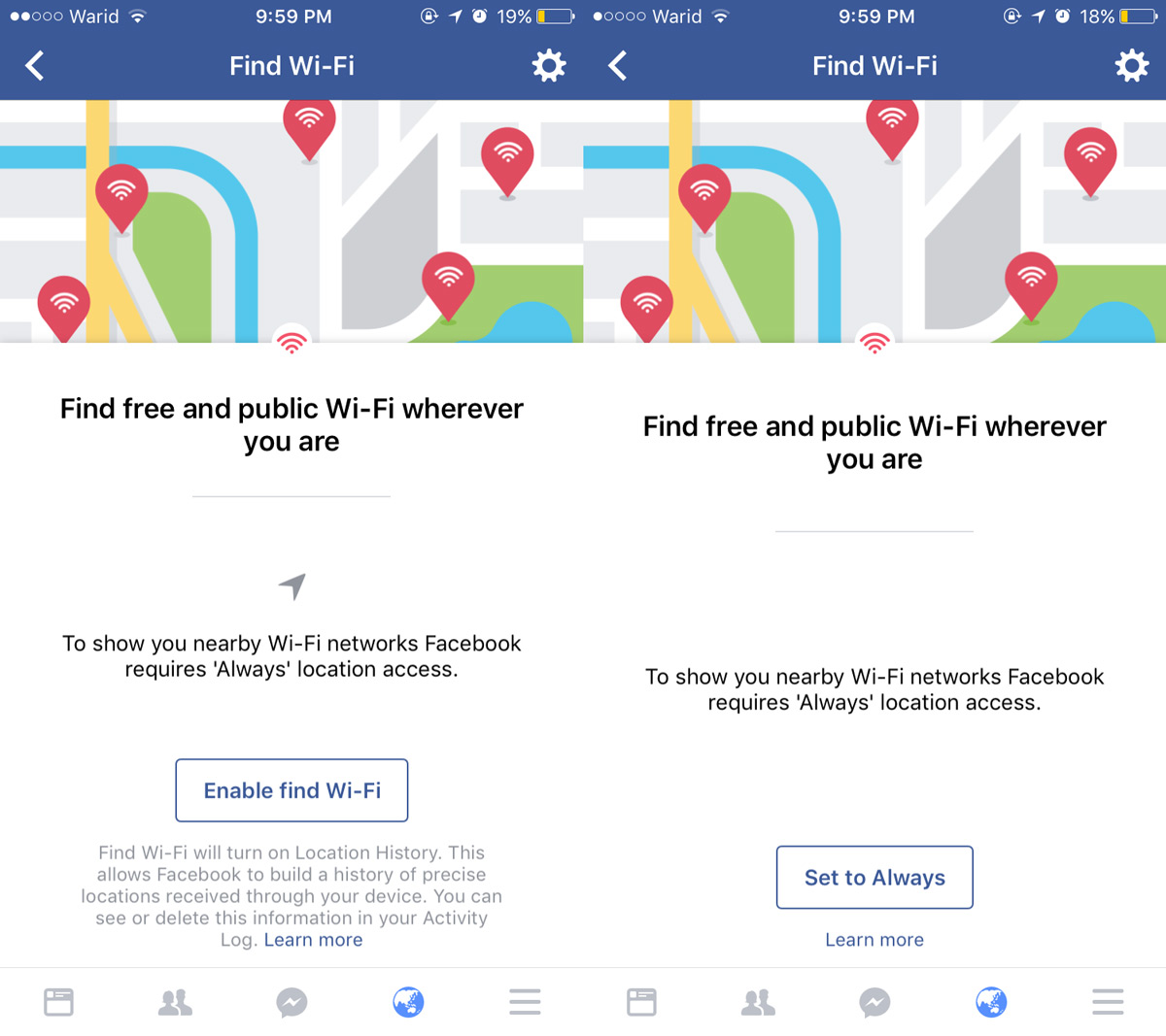 Facebook seems to be on course to turning into Big Brother. It has a new feature that tells you when public Wifi networks are available and where. A notification tells you when a public network is available ‘nearby’, and asks you to enable the WiFi feature to find and connect to it. In order to show you these public networks, Facebook asks to use your location even when you aren’t using the app. It will send you notifications whenever a public network is nearby. The way the notification appears, an unsuspecting user will simply tap ahead and give it all the permission it needs because free WiFi. If you’ve already done that, here’s how you can turn off Facebook WiFi and why you shouldn’t even use it.