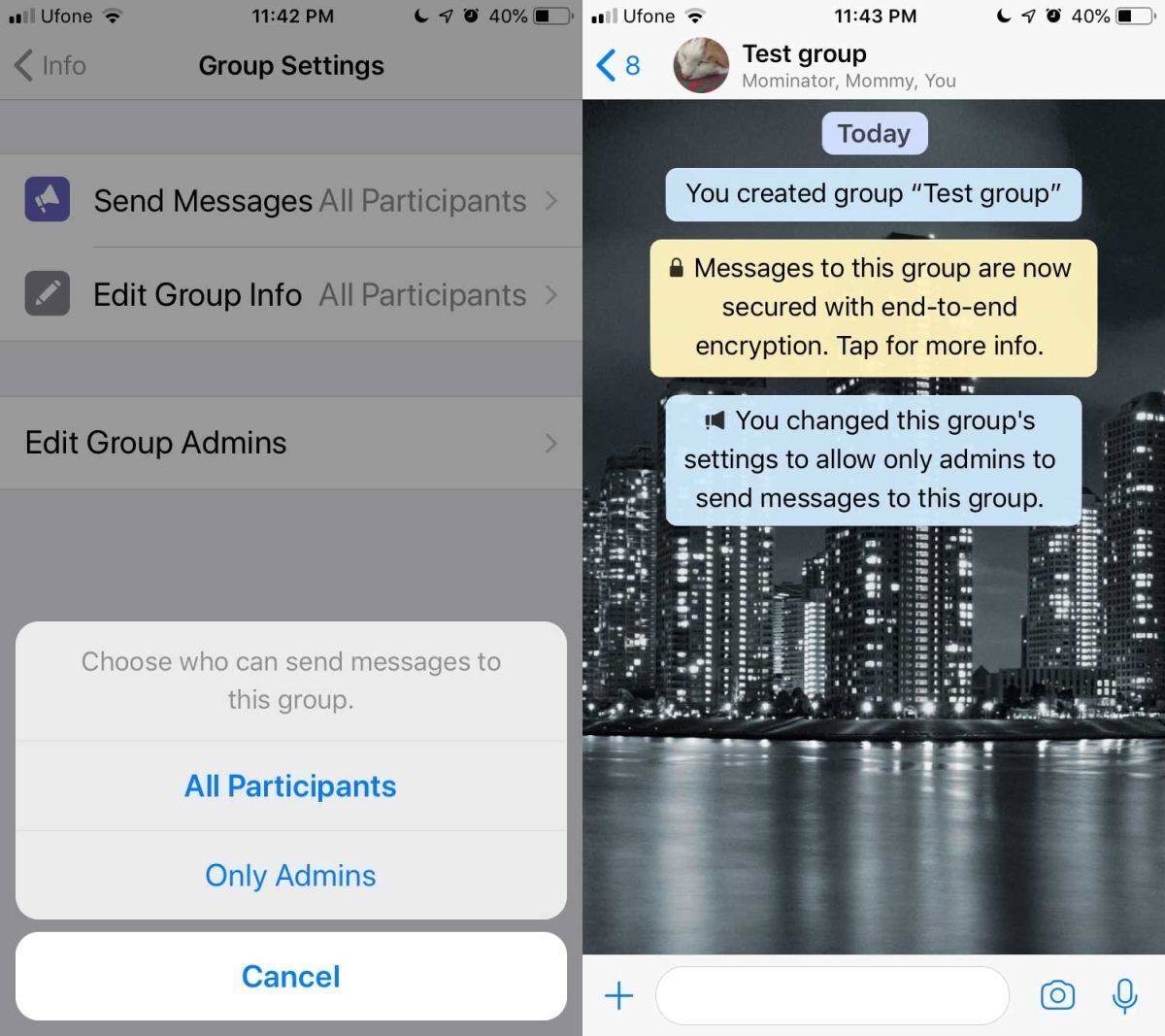 This will open a menu with two options; All Participants, and Only Admins. Tap the Only Admins option, and from that point forward, only group administrators will be able to send messages to the group. The entire group will be notified about this change.