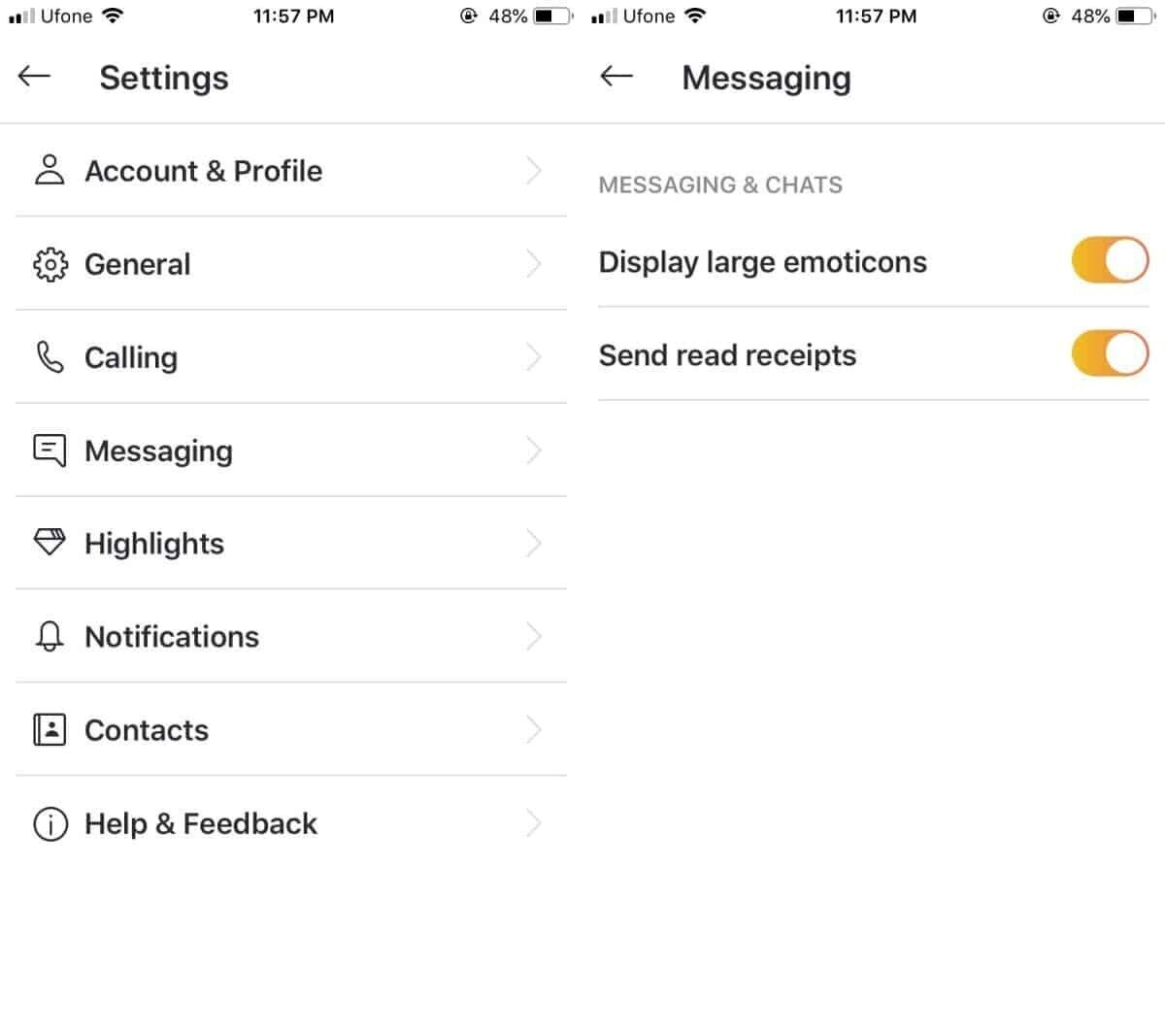 On the Skype settings screen, you will see different groups of settings you can manage. Go to the Messaging settings, and turn the Send read receipts switch off.