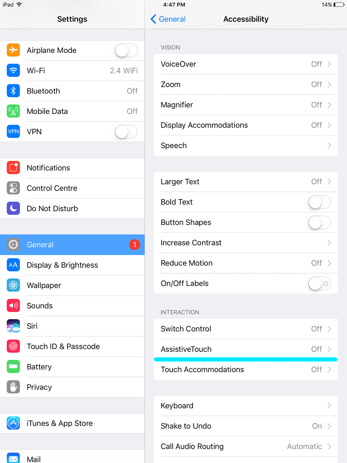 Go to Settings > General > Accessibility (scroll down) > Assistive Touch (scroll down)