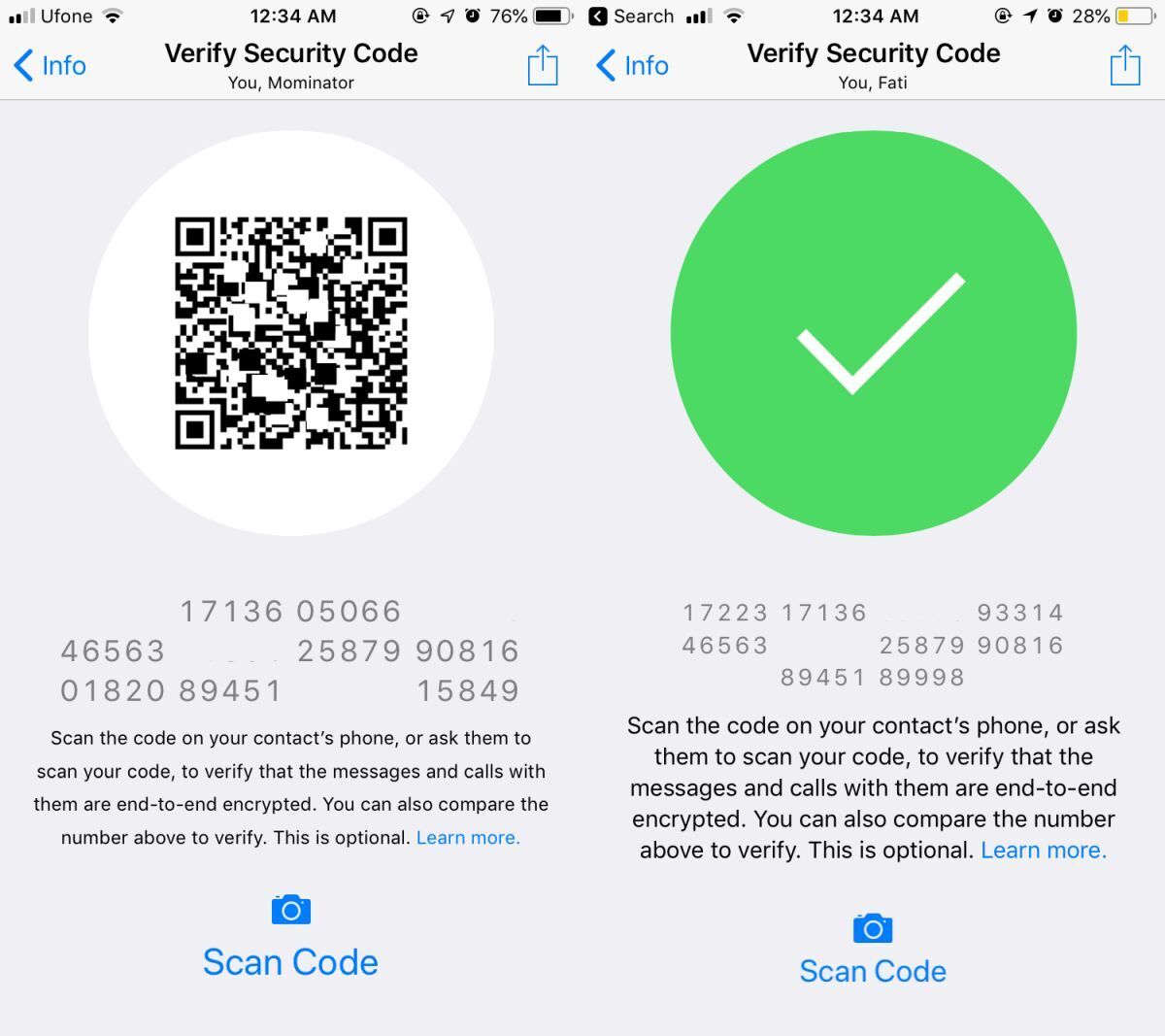 If you’re both physically in the same area, tap the Scan Code button at the bottom and then point it at the code on your friend’s screen. If the green tick appears, you both have an encrypted conversation.