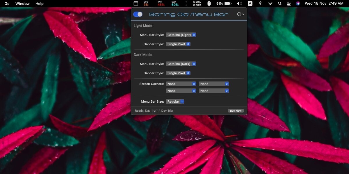 Boring Old Menu Bar offers other customization options for the menu bar. We covered an app that allows users to set a custom menu bar color on Big Sur however, if you don’t like the transparency of the menu bar in Big Sur and would like a solid color on the menu bar, Boring Old Menu Bar can do the job.