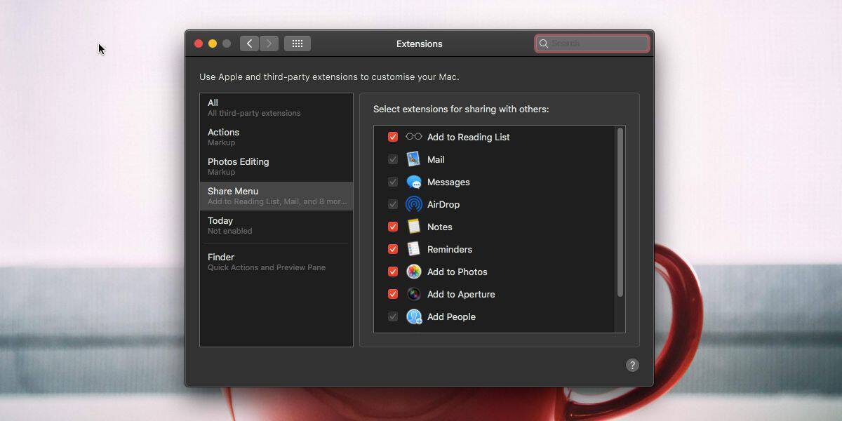The options that appear on the Extensions preference are for apps that support the share menu on macOS. If an app doesn’t support the share menu, you cannot force it to appear in this list. As for the stock apps and their sharing options, there’s no way to force them out either. They’re all mostly apps that you cannot uninstall from macOS e.g., the Messages app so they will be appearing in the share menu whether you like it or not.