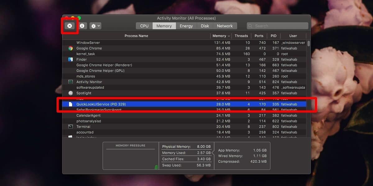 This next step might take a little time. Open Activity Monitor. You can open it from the Launchpad, or you can search for it via Spotlight. Once it’s open, look for all Quick Look processes. Tap the Q key and it will jump to the first process that begins with that letter. Keep tapping it until you find a Quick Look process. With the process highlighted, click the close button at the top (see screenshot below) to quit it. Repeat this for all Quick Look processes. Additionally, look for and quit all QuickLookSatellite processes.