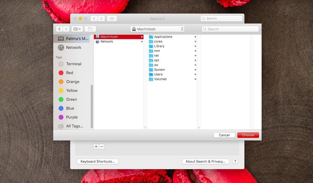 Select your Mac’s hard drive or SSD, whichever you have. Do not select any of its sub-folders. Select the entire drive and then click Choose. Confirm that you want to add the drive to the no-index list for Spotlight.