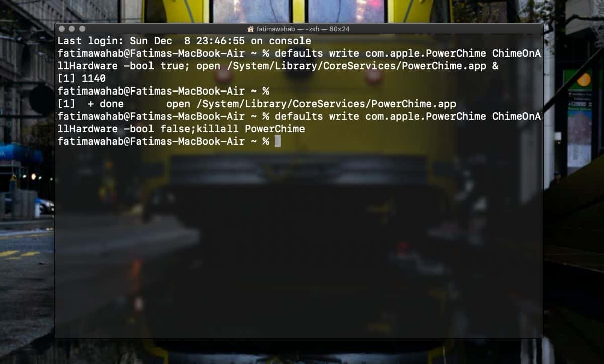 defaults write com.apple.PowerChime ChimeOnAllHardware -bool false;killall PowerChime
