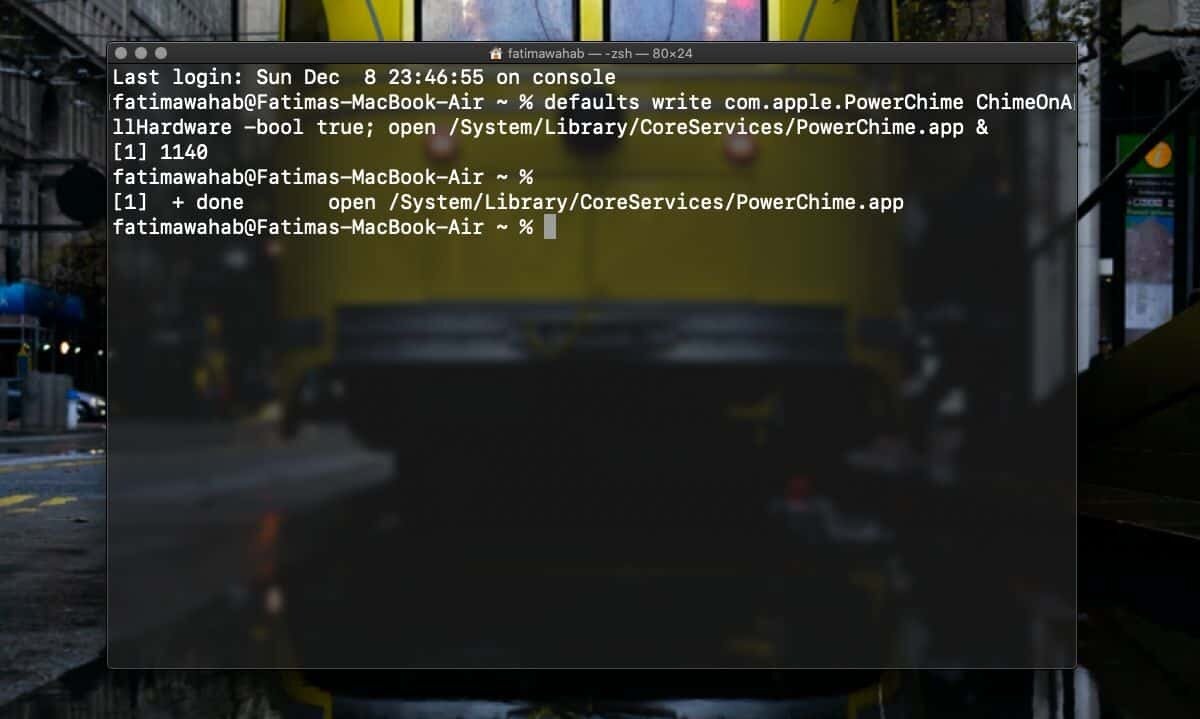 defaults write com.apple.PowerChime ChimeOnAllHardware -bool true; open /System/Library/CoreServices/PowerChime.app &