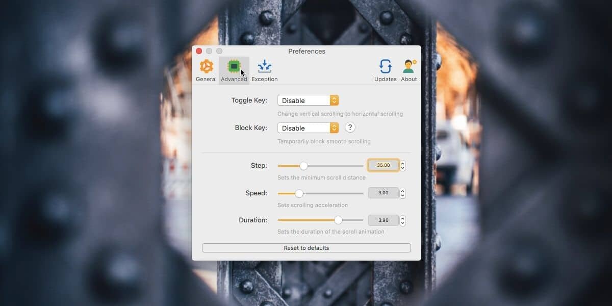 Finally, you can also manage the scrolling smoothness with Mos. Go to the Advanced tab and tinker with the three sliders there; Step, Speed, and Duration. The Step sets the minimum scroll distance i.e., how ‘far’ or how many ‘lines’ are scrolled. The Speed has to do with smoothness and how ‘fast’ the scrolling appears to be. Duration is for the scroll animation and while it’s purely a cosmetic change, it may effect how fast the scrolling appears.