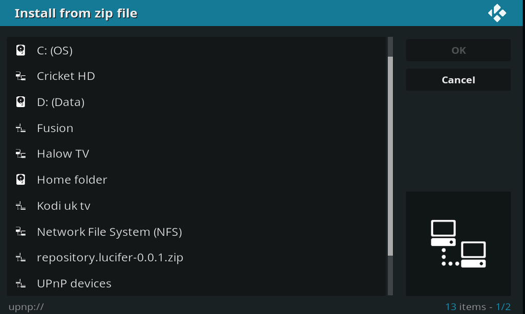 - Select Install from zip file and then click on the Lucifer zip file. This will download the Lucifer Repository onto your Kodi. A notification will confirm when the repository has been successfully installed.