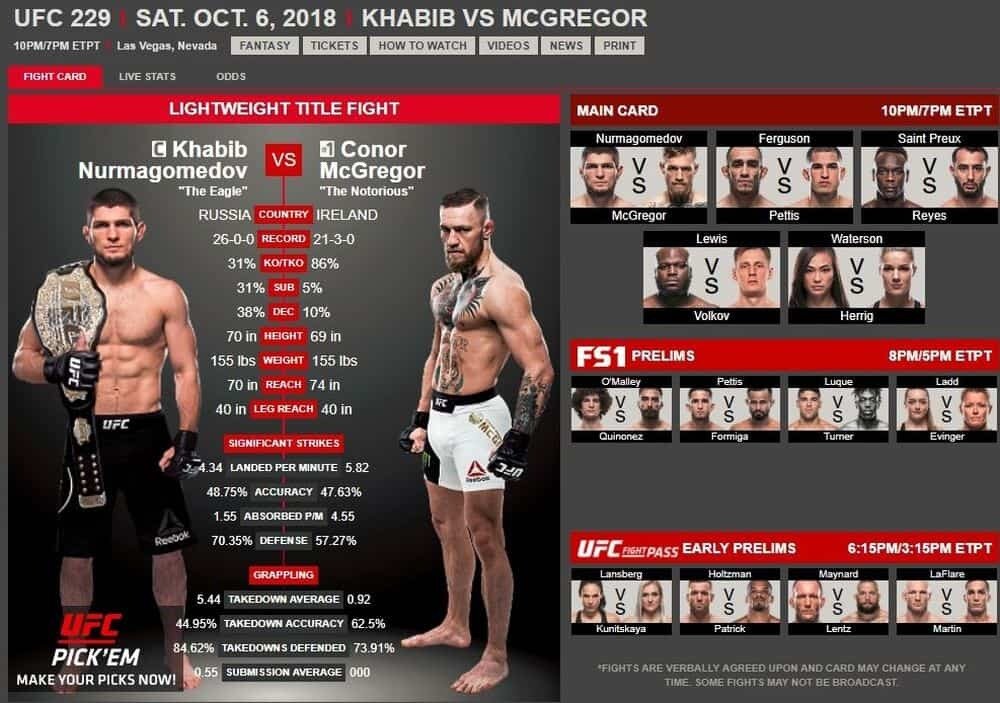 UFC 229 pits Conor McGregor against Khabib Nurmagomedov in what is sure to be an intense battle of the lightweights. It takes place October 6, 2018 at the T-Mobile Arena in Paradise, Nevada. Early preliminaries will start as early as 7:00 PM ET with the main bouts kicking off at 8:00 PM. The McGregor Khabib main card will begin around 10:00 PM ET.