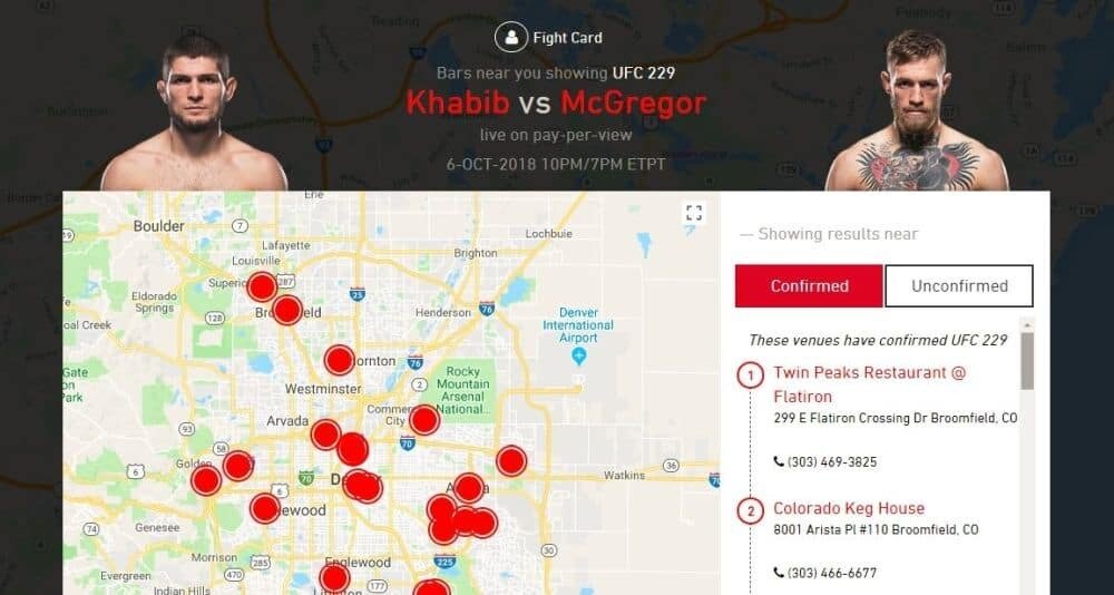 Public licenses for streaming pay per view UFC fights are purchased by thousands of bars and restaurants across the world, especially in the countries listed above. UFC provides a map that lets you search for showings of each upcoming fight, including 229. Check out the official bar browser offered by UFC.com, switch to your region, then call some friends up and see where you can go once the bout begins.