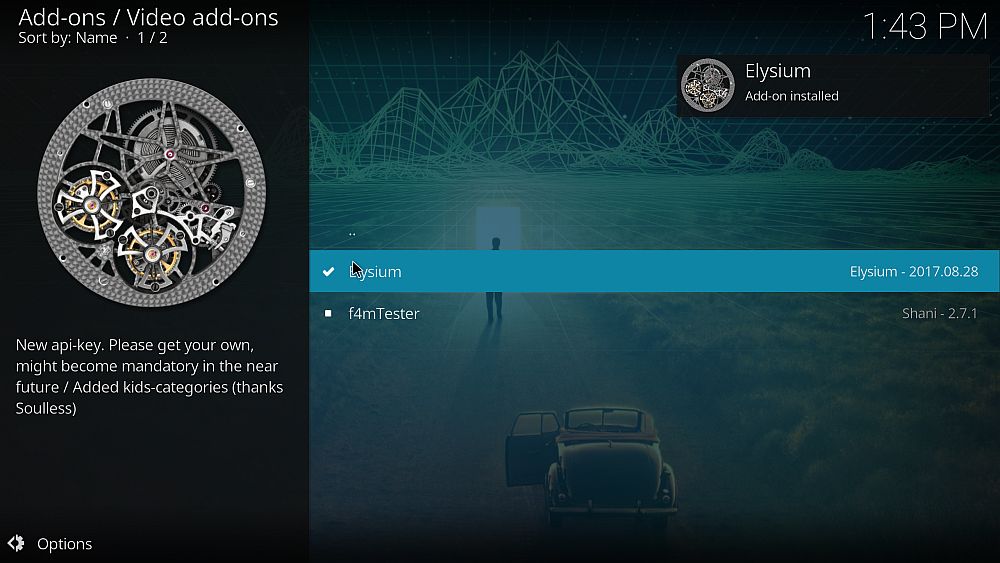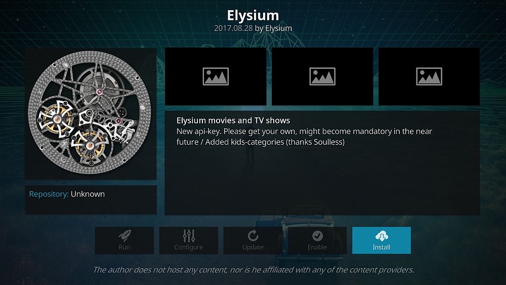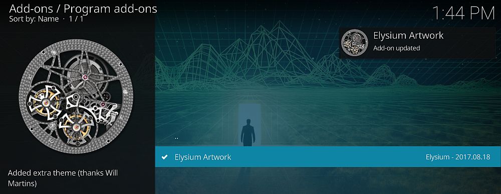 NOTE: If you’re getting the “Failed to install a dependency” error and Elysium won’t install it’s because you need to install the Artwork program addon. Instead of #16 above click on Program add-ons and then on Elysium Artwork. Then resume …