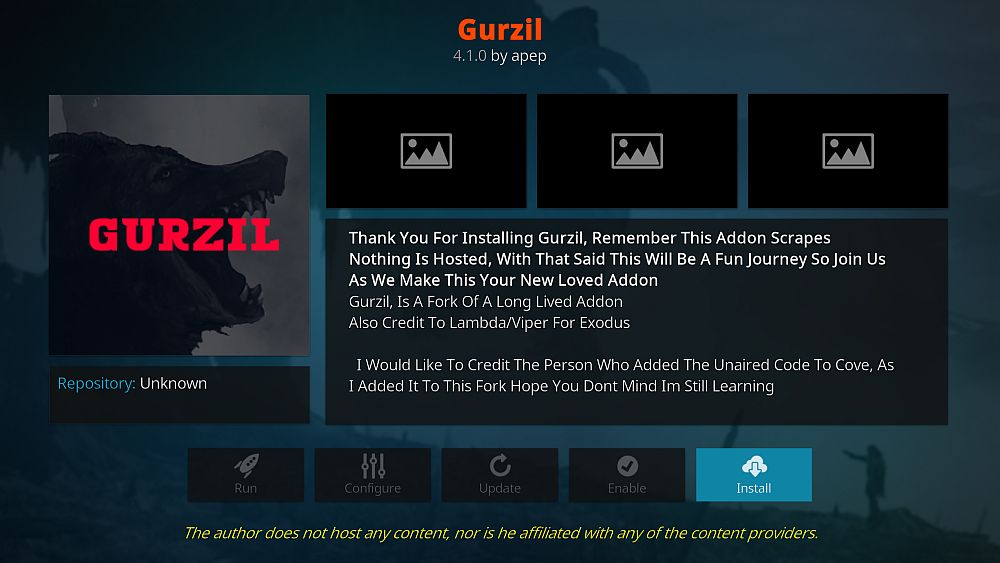 - A screen will open describing the add-on. Select Install from the menu at the bottom