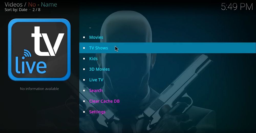 - Now you’ll see options for Movies, TV Shows, Kids, 3D Movies, Live TV, Search, Clear Cache DB, and Settings. This add-on is a little different to the others, so the menus looks different but the functions are very similar