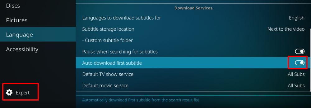 - Enable the “Auto download first subtitle” option (Note: this option is not available in “Basic” mode. See lower left corner gear icon – toggle it to choose Standard, Advanced or Expert mode).