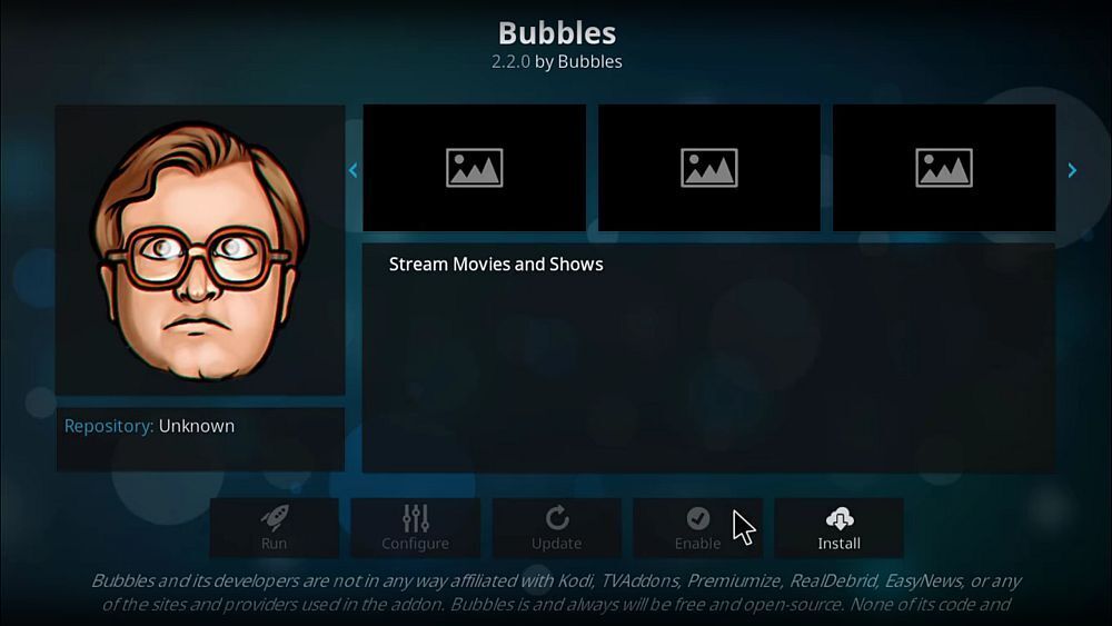 Bubbles is a very new add-on which is one of the trickiest we have ever come across to install, but once you get past that, it has plenty to offer. It is a simple add-on which allows users to access movies, tv shows, documentaries, short movies and kids tv shows. These are sourced from various different places, but the majority of sources appear to be P2P sites.