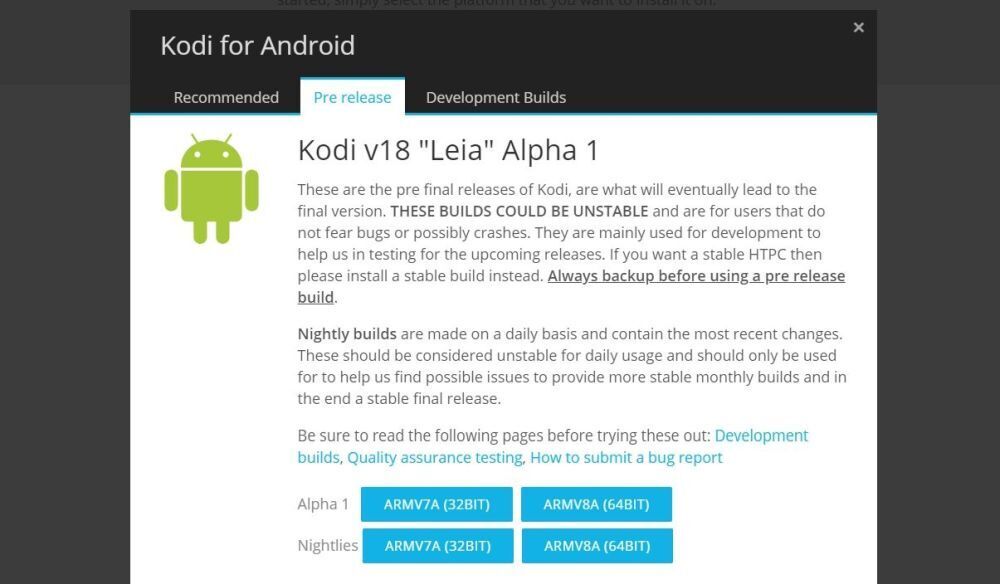 When you head to Kodi’s downloads page and click on the Android icon, you’ll notice several tabs at the top of the screen: Recommended, Pre-release, Development Builds. These three sections split the downloadable content into categories designed for a slightly different audience. Which one you choose depends on your specific needs.