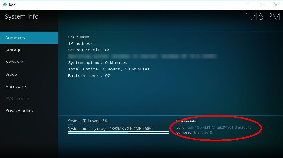 - The Kodi version number will be displayed in the lower right corner of the screen where it says “Build”.