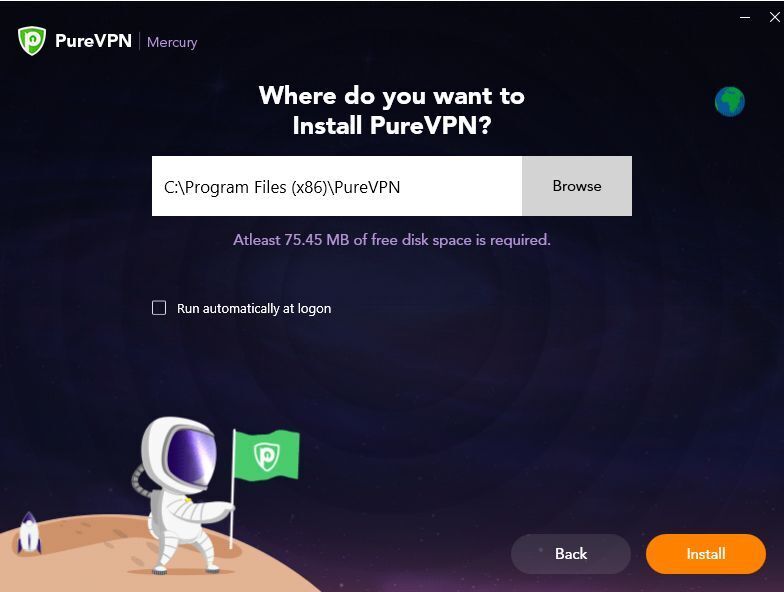 Once the app is downloaded, launch the file named purevpn_setup.exe to start the installer. You’ll see an agreement page first. Click the orange I Agree button at the bottom to continue. Next, select an installation location. The default will be ok for most users. You’ll also want to tick the “Run automatically at logon” button to ensure you’re always protected by the service. Click the orange Install button when you’re ready.