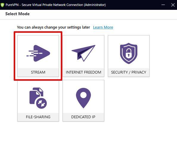 Sign in and you’ll see PureVPN’s main screen. The five main icons are designed to customize your VPN experience with greater security, better speeds, or more privacy features. Since we’re installing PureVPN to use with Kodi, you’ll want to choose the Stream option. Click the icon and PureVPN will take you to the server selection screen.