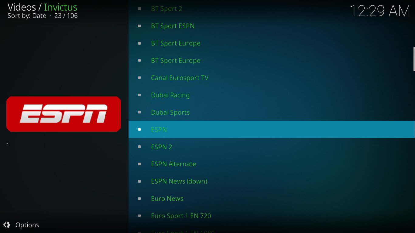 When you first use the Invictus add-on and go to the TV Channels subsection, you might be disappointed to find an empty list. This is when the second item, Update Channel List, becomes useful. When you click it, Invictus will require a confirmation and then rebuild the available channels list. This is relatively unusual and most add-ons get a refreshed list whenever they are updated. In a way, this is an interesting feature as it allows users to have an up-to-date list, possibly reducing the number of dead links.
