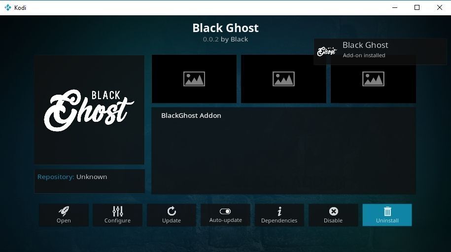 - When the installation is complete, you can access Black Ghost from the main add-ons menu at any time.