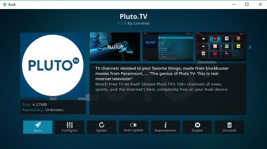 - When the installation completes you can access Pluto.TV from the main add-ons menu at any time.