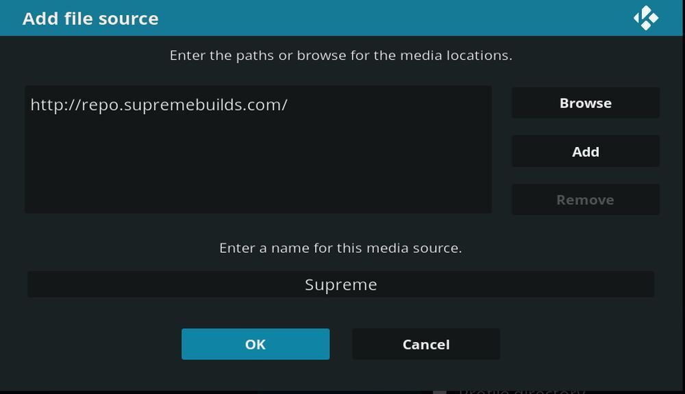- In the pop-up box called Add File Source which will appear, click where it says <None> and enter the following URL exactly: https://repo.supremebuilds.com Click OK and then give the new source a name such as Supreme before clicking OK again.