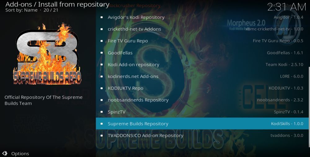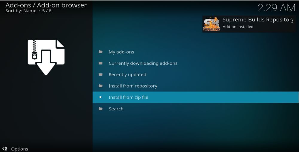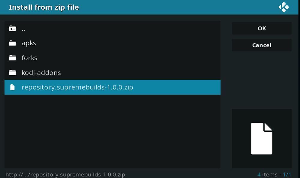- Click Install from zip file, then choose Supreme and click on a file called repository.supremebuilds-x.x.x.zip. Click OK and the Supreme Builds Repository will be downloaded onto your system.