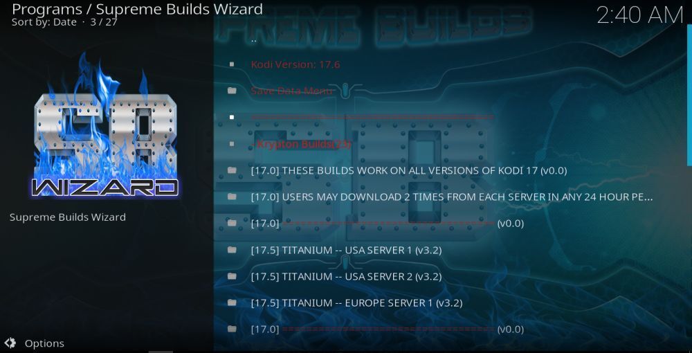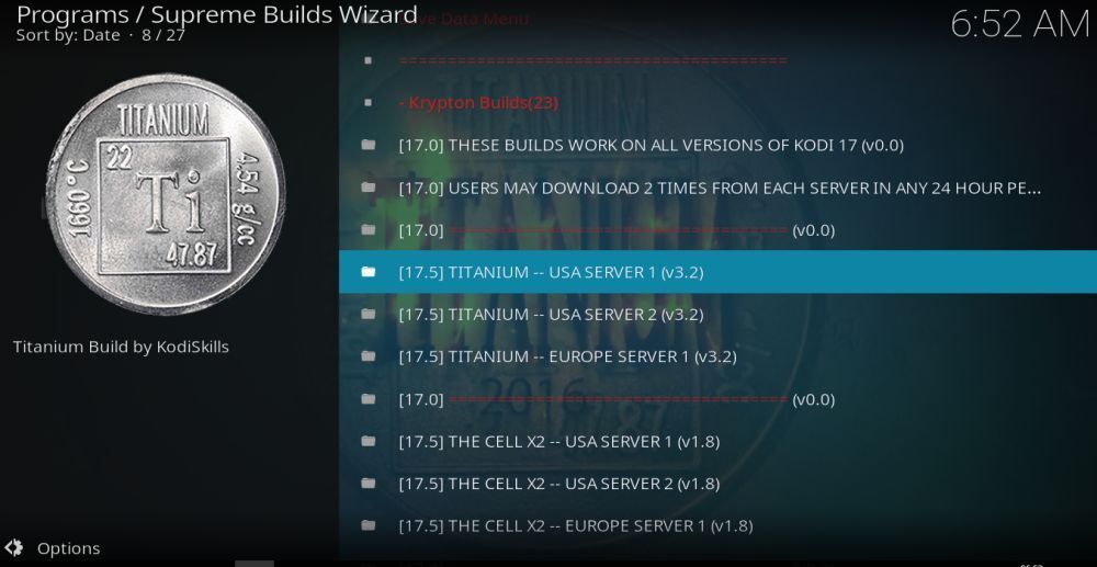 - To download and install the Titanium Kodi build, open the Wizard and select (Supreme Builds) Builds. Choose one of the Titanium Build options from the menu that follows and then just follow the simple onscreen instructions to get Titanium installed and running.