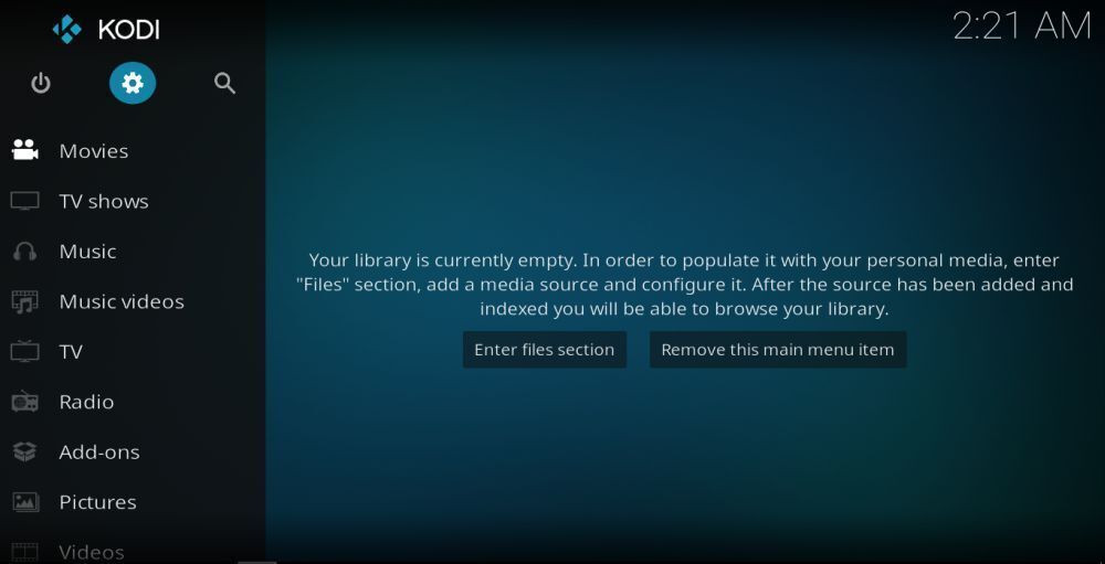 - Open Kodi and click on the Settings icon, which resembles a gear wheel, and is in the top left of the screen.